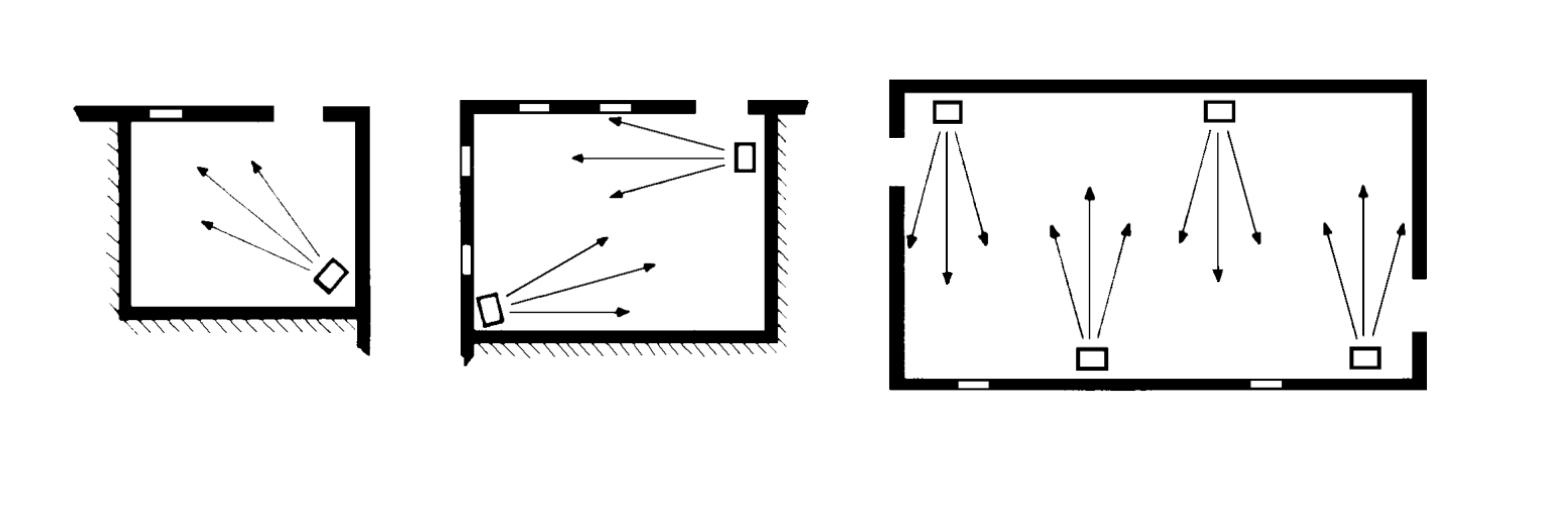 Vysoké stropy a velké objemy mohou vyžadovat kombinaci několika jednotek, jejichž proudění se doplňuje a zabraňuje tak tvorbě studených zón. Směr ohřátého vzduchu a úhel proudění se vždy volí individuálně na základě rozmístění technologie nebo osob na pracovištích. Obecně platí, že jednotky jsou umístěny do rohů tak aby kónický tvar proudu vzduch pokryl co největší plochu a aby proud vzduchu směřoval k nejvzdálenějšímu místu. Pro správné rozmístění více plynových ohřívačů je nezbytné, aby dosah vzduchu nenarážel nejen na stěny, překážky ale ani do proudu vzduchu jiné jednotky. Ukázky vnodných instalací jsou na obrázku níže.
