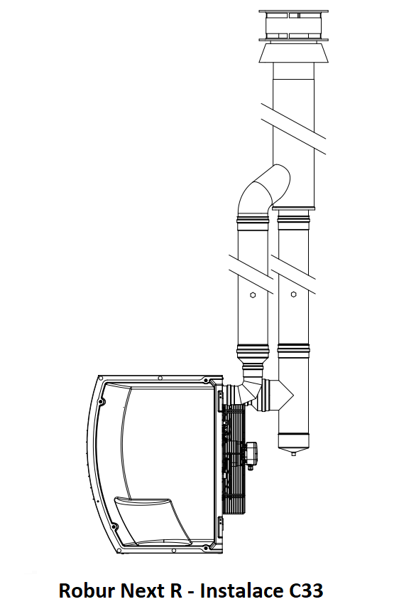 Jednotky Robur jsou uzavřené spotřebiče - typ "C", je tedy nezbytné zajistit odpovídající přívod vzduchu pro spalování a odtah spalin mimo vytápěnou místnost. Toto lze řešit systémovým odtahem spalin přes obvodovou stěnu "C13", nebo použít komínový systém pro odtah spalin např. střešním pláštěm - instalace "C33" viz. obrázek.