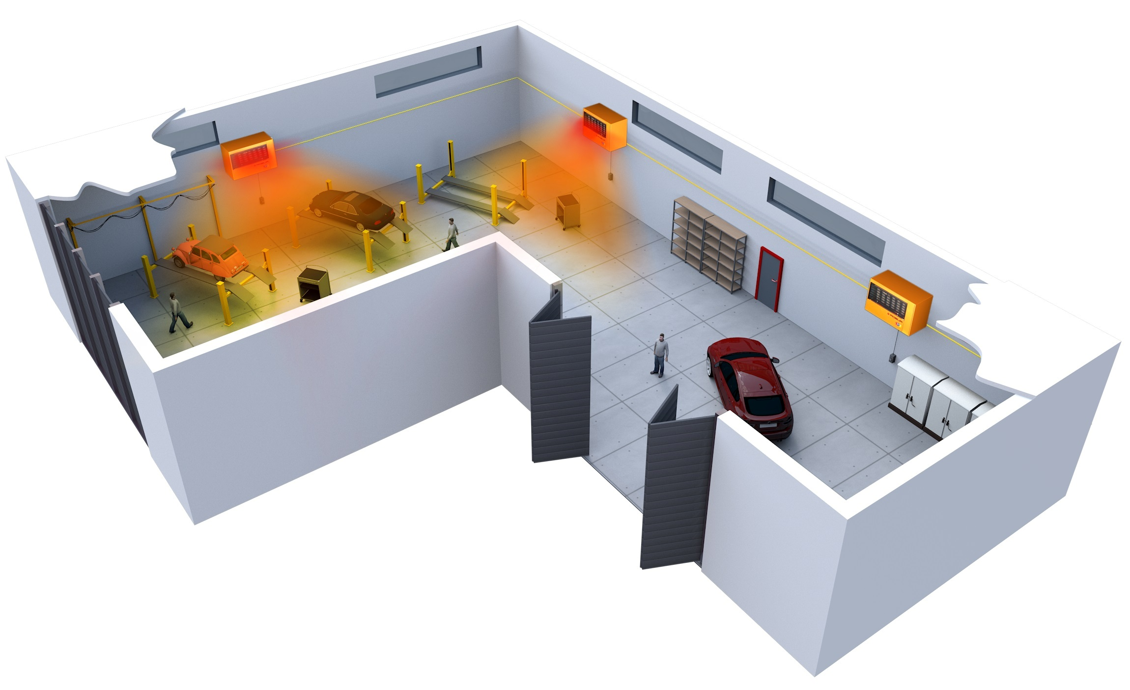 - Pro menší dílny či sklady postačí jedna jednotka, která ohřívá celý prostor